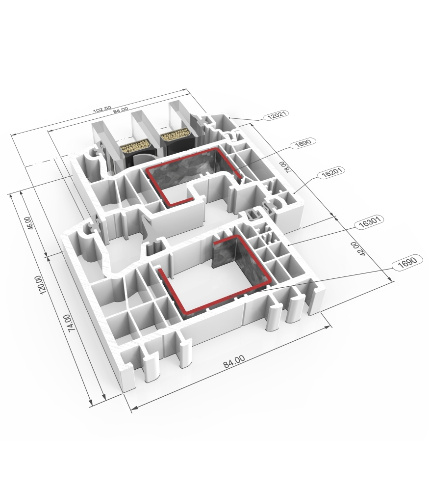 Uw desde 0,79 W/m2K. Apresenta uma capacidade máxima de enchimento de vidro de 54 mm e um isolamento acústico até 46 dB, oferecendo um excecional conforto no interior da divisão. Possibilidade de elemento central de apenas 145 mm.